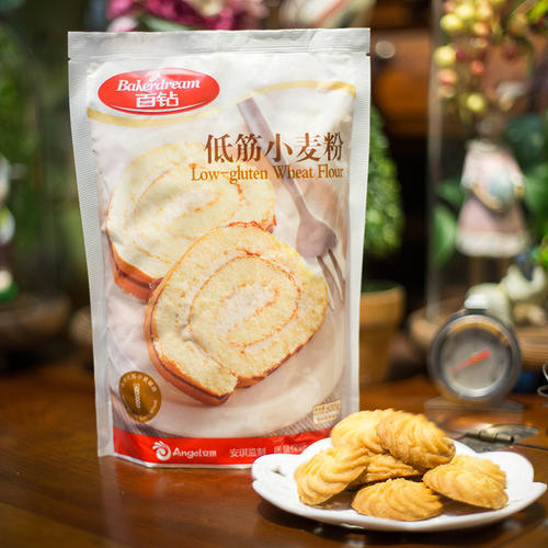 低筋面粉:又叫薄力粉,cake flour,蛋白质含量6.5-9.5%,可以用按照质量比四份中筋面粉加一份玉米淀粉(其它淀粉也可以)混合配成。适合做蛋糕、饼干、蛋挞等松散、酥脆、没有韧性的点心。