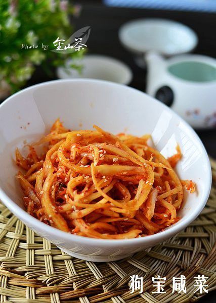 说起狗宝咸菜,东北人都知道是啥玩意,南方人就不知道了,得说桔梗。对,狗宝,又叫桔梗,是一种朝鲜族传统小菜,韩式料理店里常见,很多超市里韩式拌菜柜台里的看家小菜,价格最贵,一斤要卖到十几二十几元钱,看着红彤彤的非常诱人食欲,每次经过都忍不住要买上点,因为带着厚重的调味料,湿哒哒的分量很重,一斤也买不上多少,一顿就吃没了。