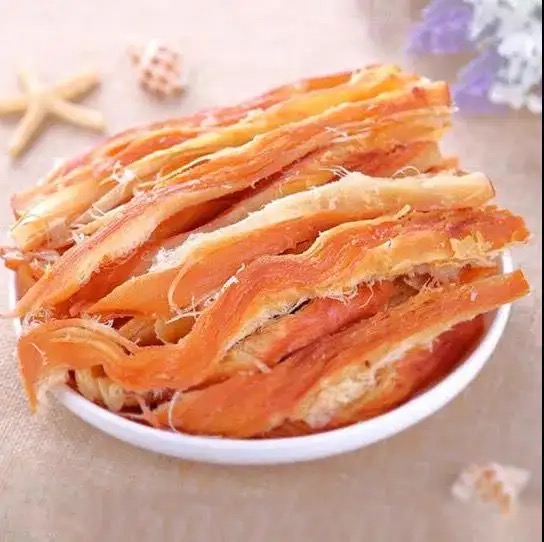 新鲜鱿鱼晾干加工后制成的鱿鱼丝,入口香酥,回味甘甜,追剧必备小零食,你值得拥有。