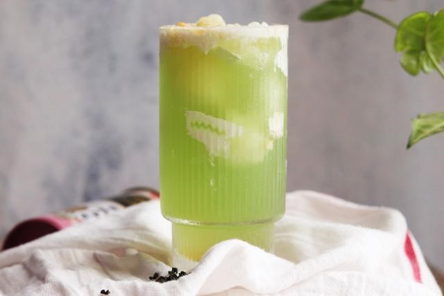 这是一杯鸡尾酒和乌龙茶做成的冷饮,翠绿的颜色一看就很解暑。