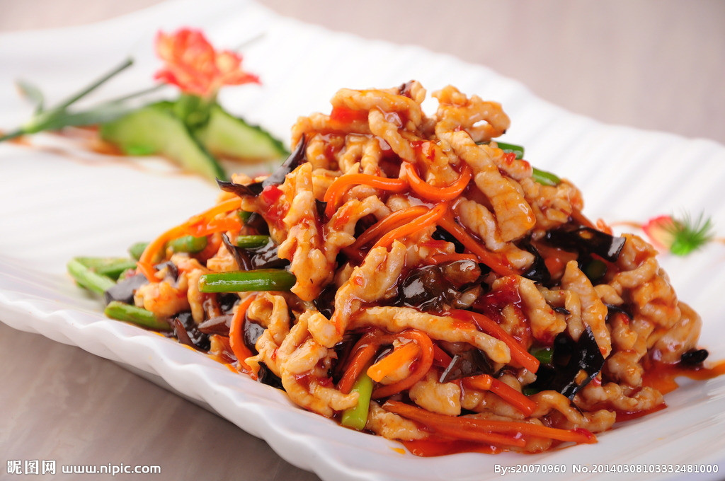 主料为猪肉、黑木耳,辅料因做法而各异,但多为胡萝卜、竹笋、辣椒等。猪肉选用三成肥、七成瘦的切丝滑炒,吃起来肉丝质地鲜嫩。