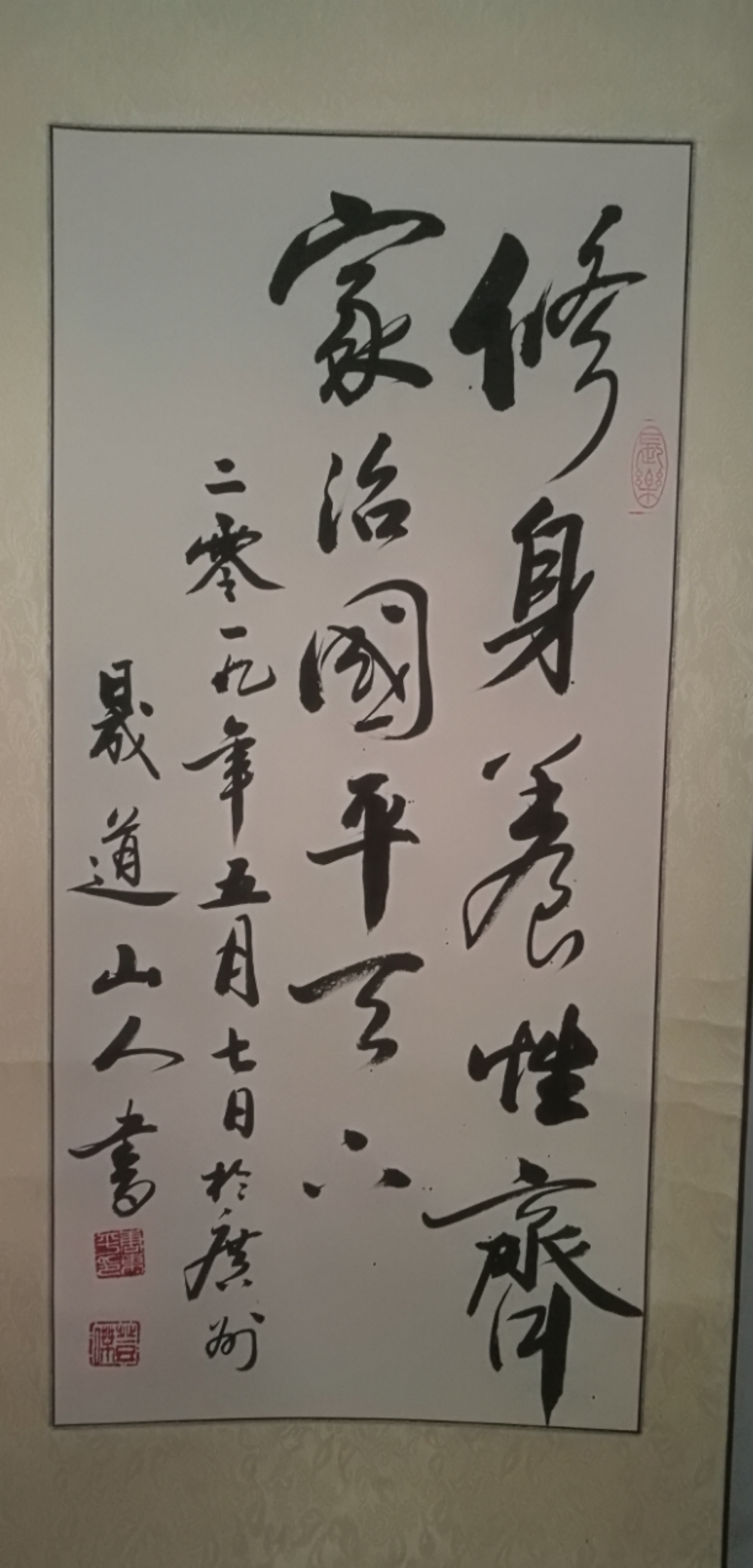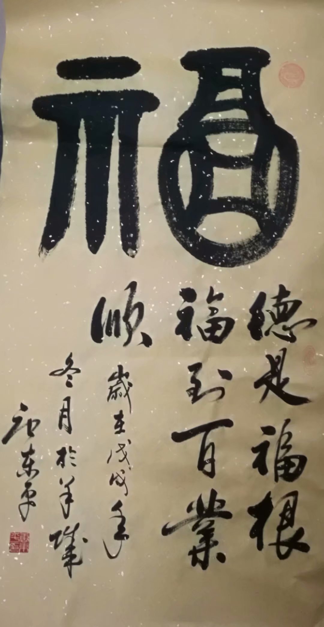 福中有寿,寿在福中 唐东平,字登杰,号晟道山人,祖籍湖南,出生于广西桂林,华南理工大学工商管理学院副教授,硕士研究生导师,中国大众文化学会书画艺术专业委员会委员。本科毕业于广西师范大学,研究生毕业于哈尔滨工程大学。少年追随艺术大师伍纯道教授学习书法,并且得到胡问遂等名师指点,广泛吸取古今书法精华,孜孜不倦,厚积薄发,形成了独特的书法风格,作品刚劲中饱含秀润,端庄中富有灵动,既具有王羲之书法的飘逸,赵孟頫书法的秀丽,也体现了柳公权的骨力,深受收藏爱好者喜欢。