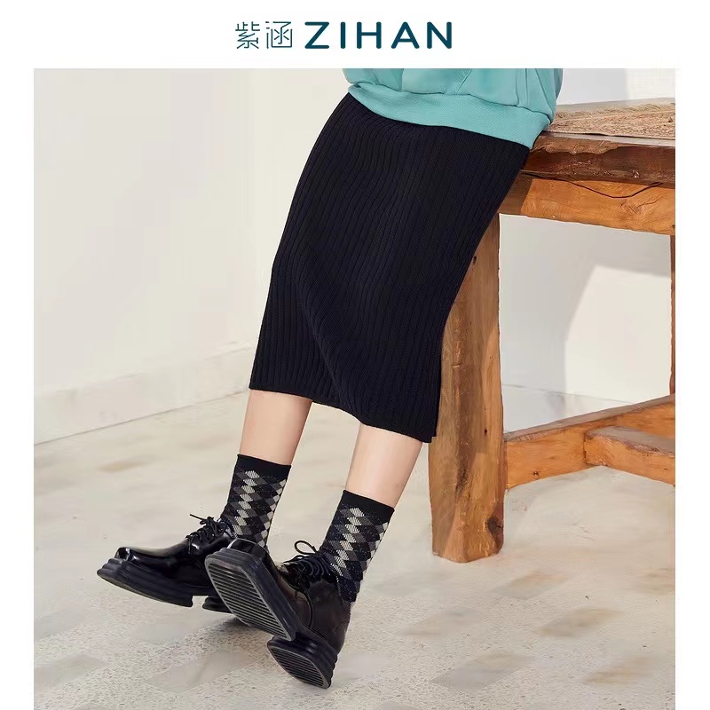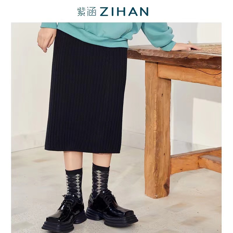 初系列 紫涵2021年冬新品女松紧腰弹力针织直筒开叉半身裙中长款