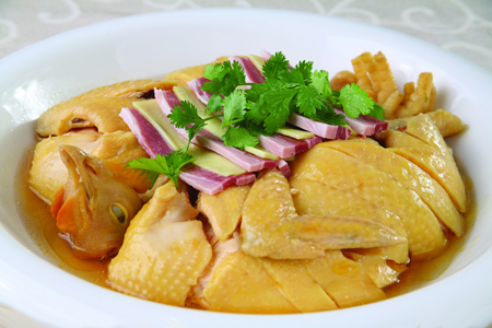 盐焗鸡制法独特,味香浓郁,皮爽肉滑,以沙姜油盐佐食,风味极佳。色泽微黄,皮脆肉嫩,骨肉鲜香,风味诱人,是宴会上常用的佳肴。