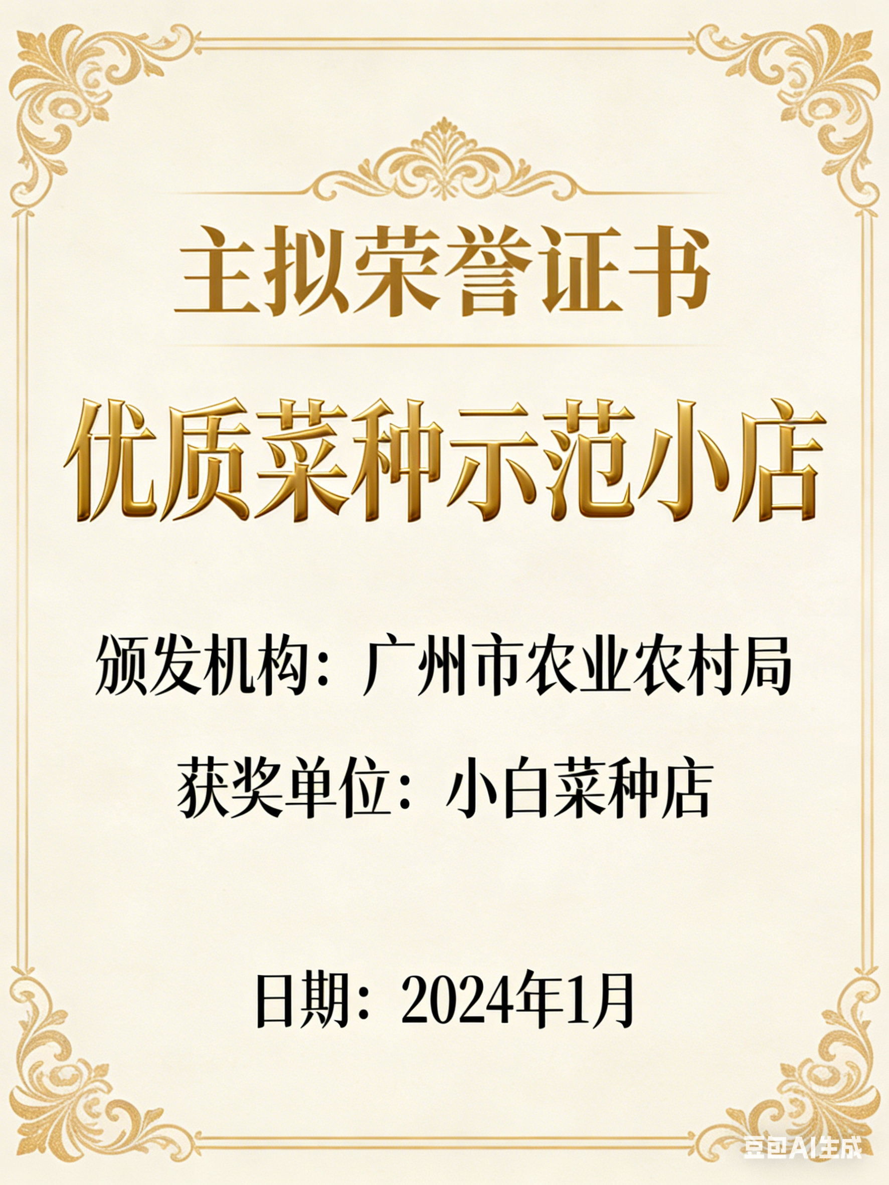 这份 “2024 年广州市优质菜种示范小店” 荣誉证书,是由广州市农业技术推广协会于 2024 年 12 月颁发的,证书上清晰标注了 “小白菜种店” 在菜种育苗标准化、种子品质稳定性等方面的突出表现,是对小店在本地菜种供应领域专业度与口碑的官方认可,也侧面体现了小店种子的市场信赖度。