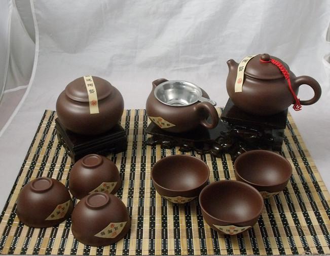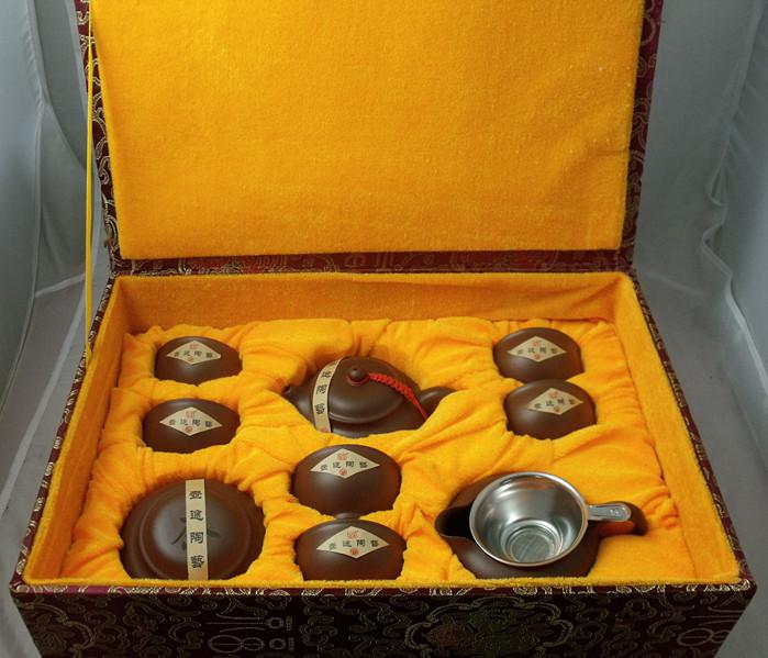品名:10件套壶途紫砂工夫茶具 规格:长36cm*宽26cm*高12cm 组合:仿古紫砂壶一把、公平壶1个、杯子6个、茶叶罐1个、过滤网1个 外包装:锦盒