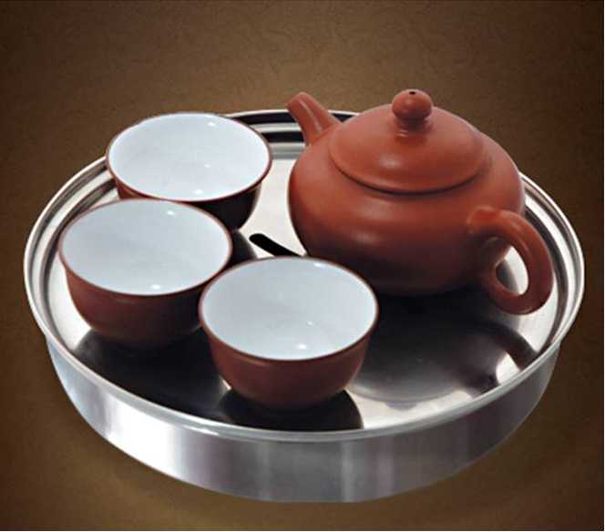 不锈茶盘规格: 直径16cm×高4cm 材质及组合: 不锈茶盘1副、茶壶1把、 茶杯3个 包装:布袋
