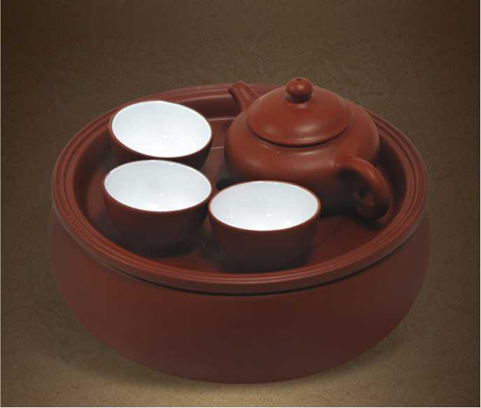 品名:鼓形旅行茶 具(紫色、棕色) 货号:GF-0929 茶盘规格: 直径18cm×高8cm 内含: 朱泥茶盘1副、茶 壶1把、茶杯4个 包装:布袋