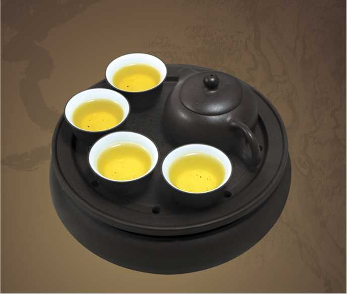 品名:紫砂雕刻小雅致 (锦盒包装) 货号:GF-0926 紫砂茶盘规格: 直径18.8 cm×高6.5m 材质及组合: 紫砂茶盘1副、紫砂壶1 把、茶杯4个、茶巾1条