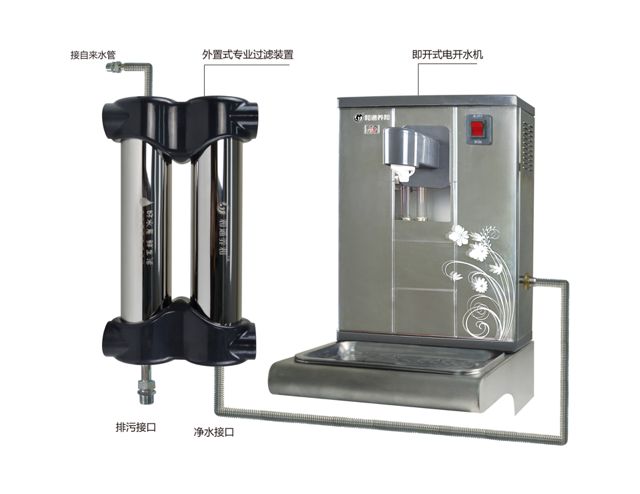 即开式电开水机,接自来水管,外置式专业过滤装置,层层过滤自来水管中的水,最后通过净水口输出健康放心的饮用水。