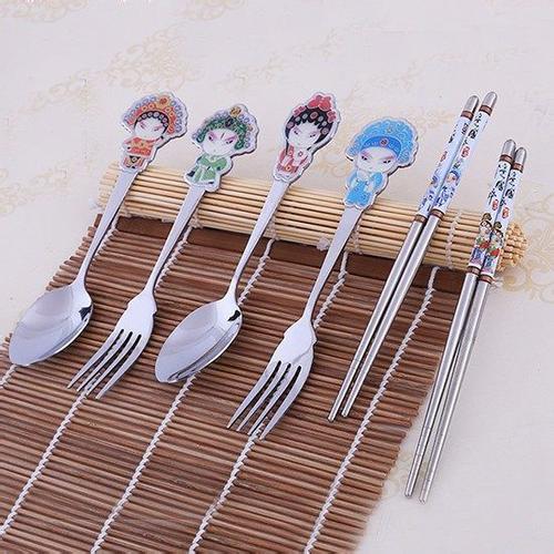 餐具把手融入中国元素,京剧卡通头像,外观吸引人,质地均为不锈钢,安全好用。