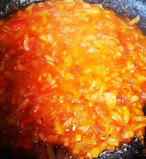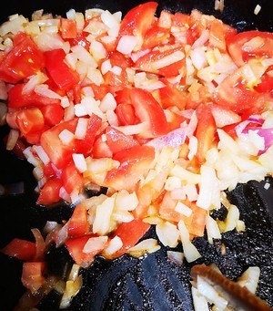 锅里放入黄油,油融化放入洋葱丁,翻炒变色。倒入番茄丁继续翻炒,炒到番茄有浓汁出来。