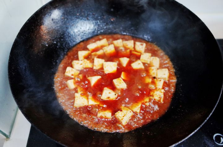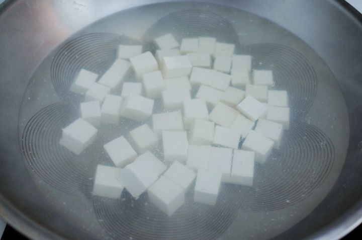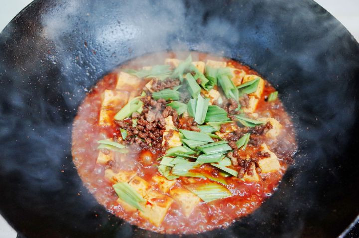 『卤水豆腐,青蒜苗,牛肉末,花椒粉,水淀粉,料酒,食用油』