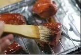在叉烧肉烤的过程中,从烤箱取出2-3次,用毛刷蘸糖水刷在表面,然后重现放回烤箱。最后一次刷糖水最好在出炉前3-5分钟。整个烤制过程不要超过30分钟