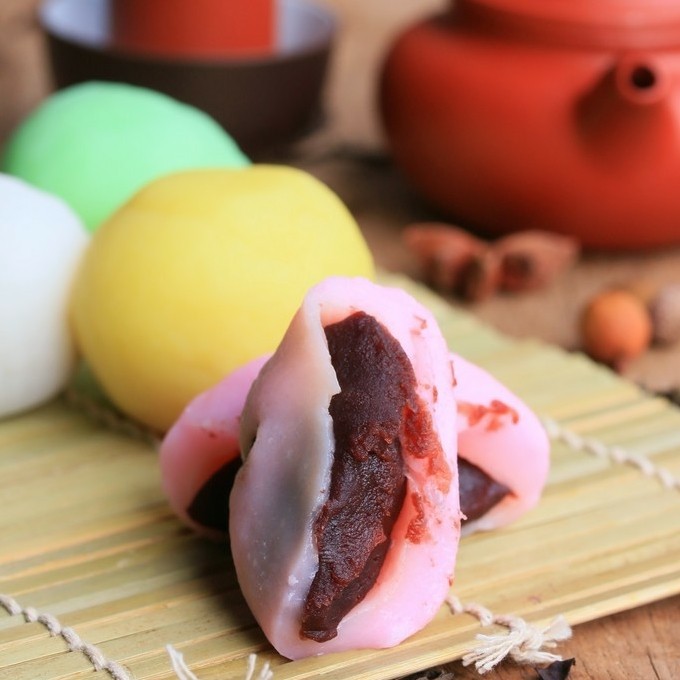 取麻薯团压扁,包入豆沙封口,包完即可。