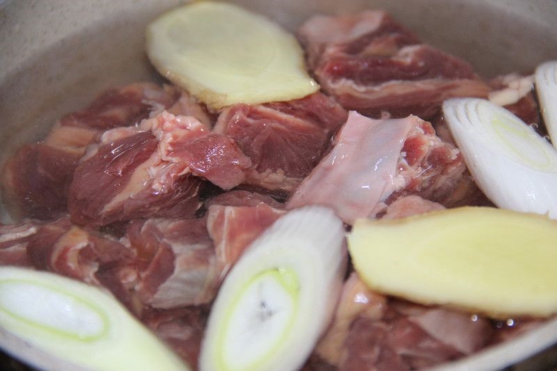 牛肉切段加葱姜料酒下入清水焯水5分钟捞出
