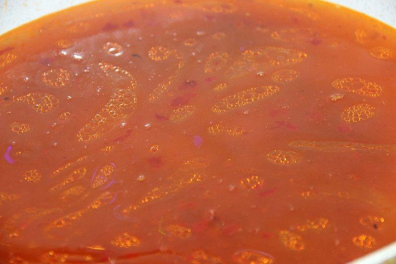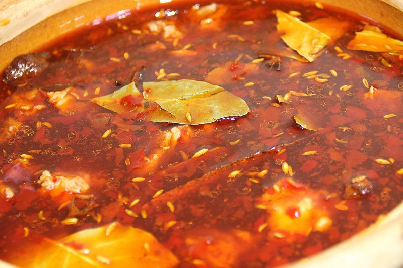 然后加入3勺豆瓣酱,炒出红油,加入1.2L水煮开