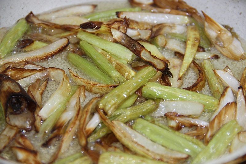 锅中放入100ml油,烧热后加入芹菜、洋葱、大葱段炸至焦黄捞出