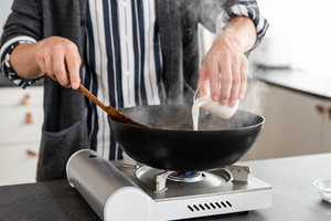 煮好后加入酸奶拌匀,再倒入一点水淀粉增加汤汁稠度