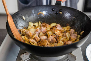 直接在刚才的锅中加入适量的油加入蒜、香叶炒香,加入洋葱、红葱头炒至变软,放入咖喱酱,黄油,香油,糖翻炒均匀,加入鸡肉、土豆、红萝卜继续炒一会儿,倒入烧开的水盖上锅盖,焖煮至土豆熟烂(时间约15~20分钟