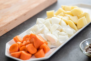 先把红萝卜切块,洋葱切块,土豆切块,切好备用