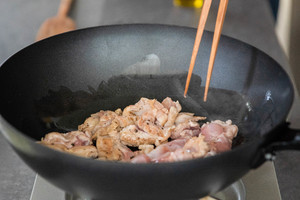 准备一个锅加入适量橄榄油煎鸡腿肉,煎至表面金黄,出锅备用 咖喱鸡肉饭的做法 步骤4