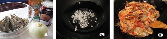 4. 待虾的表层完全变色后,加入两大勺咖喱粉 5. 倒入准备好的椰浆 6. 大火翻炒均匀,让咖喱和椰浆完全融合