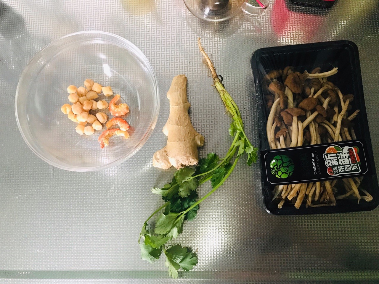 准备好所需食材,海鲜都是干的,茶树菇新鲜的