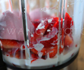 将草莓,草莓冰淇淋,牛奶和适量的柠檬汁倒入搅拌机中。