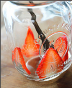 用木勺帮助分别把草莓片贴在玻璃杯的四周内测。也可以用勺子之类的。