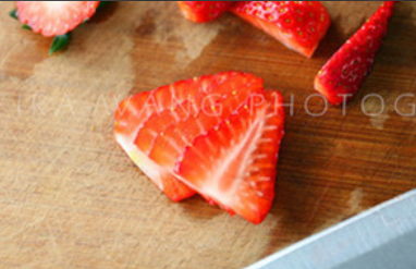 之后将剩下的草莓,全部去掉根蒂,切成4瓣。