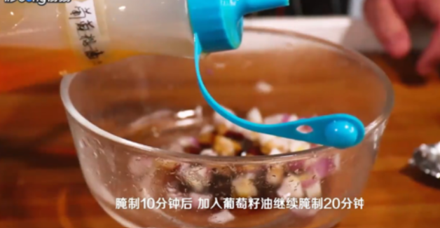 将洋葱丁放入碗中,加入调味料,腌制10分钟,加入葡萄籽油腌制20分钟。