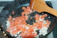 6.用锅里余油煸炒洋葱碎和蒜末,炒出香味至洋葱身软 7.放番茄丁下去一起煸炒到番茄出沙