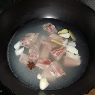 排骨剁成小块,凉水下锅,加料酒,葱姜蒜,八角,煮半个小时,中间撇出血沫,捞出凉水冲洗。