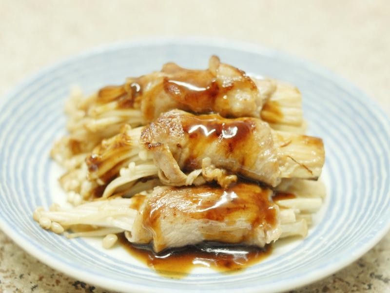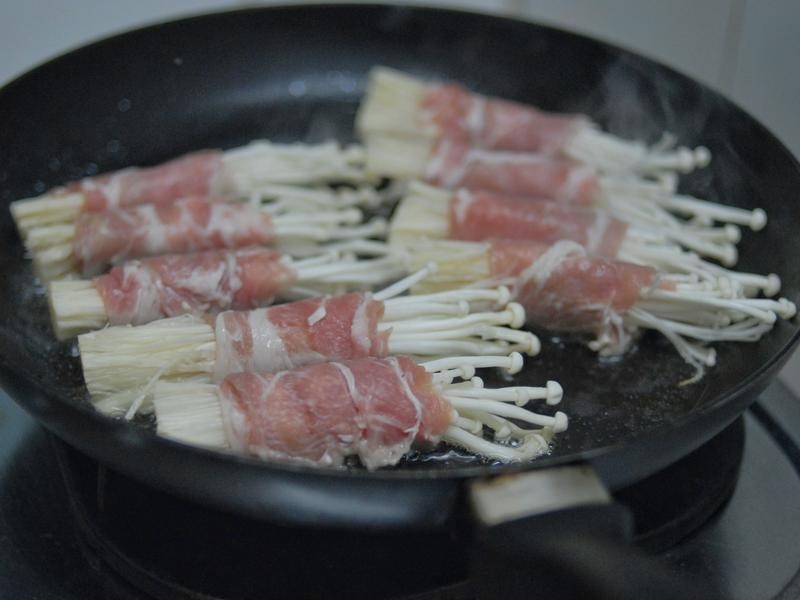 将猪肉片放平,在底部放金针菇,然后慢慢卷起。再用太白粉水封口(1茶匙太白粉 + 1茶匙水拌匀)