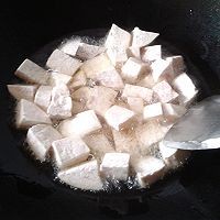 2.热油,等油温上来了倒入芋头油炸,用大火炸定型后改中火,等芋头表面变金黄时关火捞起备用。