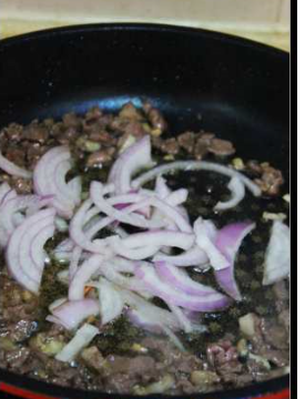 用不粘锅,加入蒜、姜粒爆香,加入牛肉,炒至变色。牛肉变色即可,放到旁边,中间放洋葱炒香。