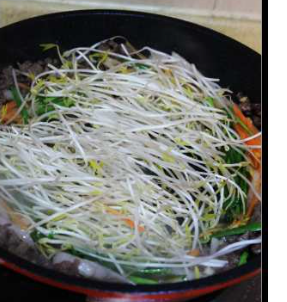 加入绿豆芽,胡萝卜等蔬菜,炒软。