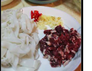 河粉用手开松散,牛肉切小簿片。蒜、姜切粒。