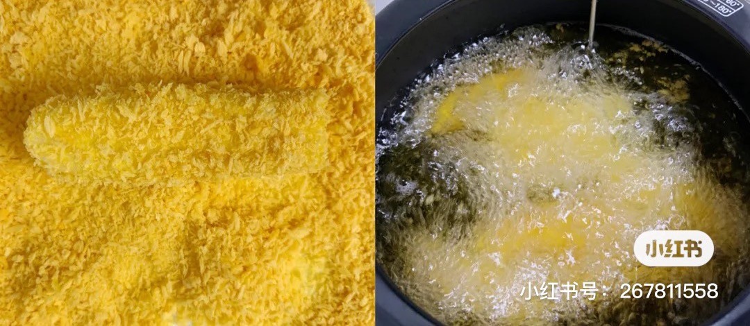 奶条依次沾满面粉、鸡蛋液、面包糠,160度下油锅炸一分钟