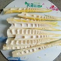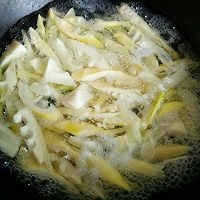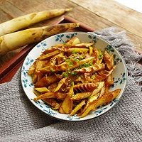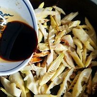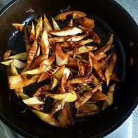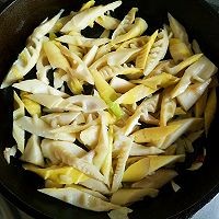 锅里放炒菜量油或者比平时炒菜油量稍多些,把笋放入锅中炒,中大火,翻炒到笋边有些焦黄的感觉最好。