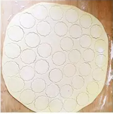 用擀面杖擀成约1毛硬币的厚度,用模子抠出圆形。