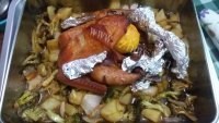 5.将腌制好的鸡肚子里塞个柠檬。将鸡尖、鸡脚包上锡纸