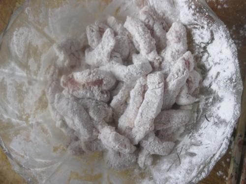 3.待油温上升至八成热,再下入肉片复炸,把糖、醋、酱油、香油调匀,肉炸脆用漏勺捞出。