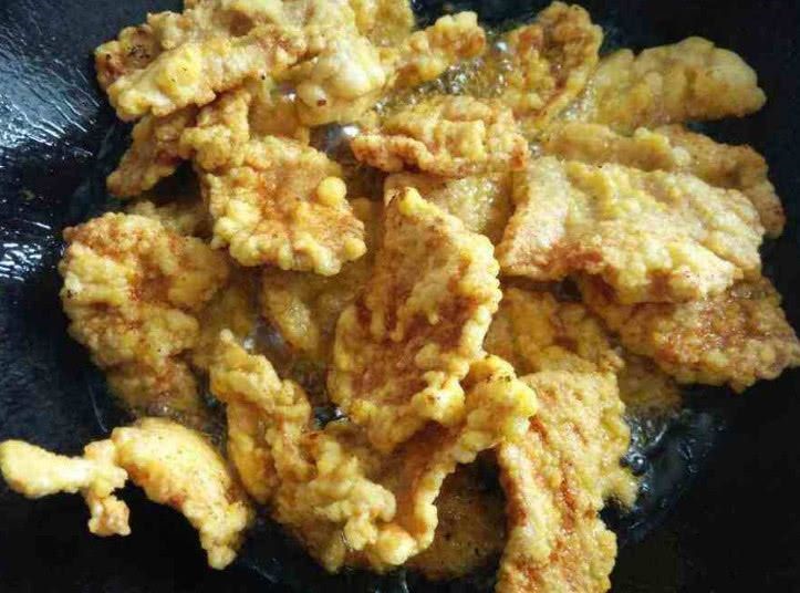 2.锅上火,加入适量油,待烧至七成热时,逐片下入挂好淀粉的肉片,炸至3分钟左右,外表挺实、敲时有清脆声捞出。