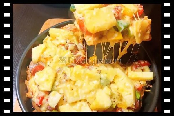在披萨上放一层凤梨片,再撒上一些芝士碎。放入烤箱中继续180度烤5分钟,即可出锅了。