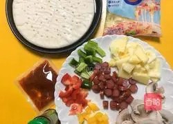 准备好披萨饼底、芝士碎、披萨酱、凤梨、香肠、彩椒、口蘑。