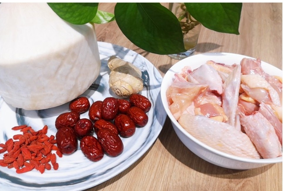 准备食材:红枣、枸杞、姜、椰子、鸡
