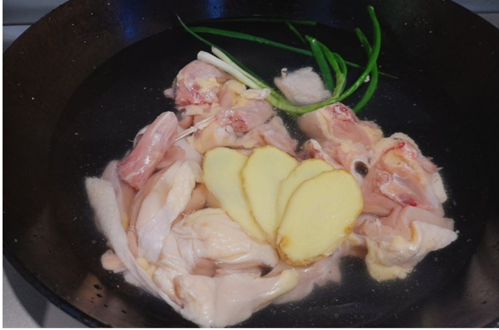鸡肉凉水下锅加葱结、姜片,水开后煮2分钟捞出