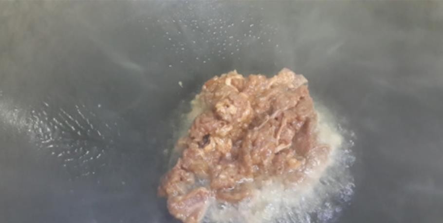 原油下锅,下牛肉,翻炒至牛肉变色。
